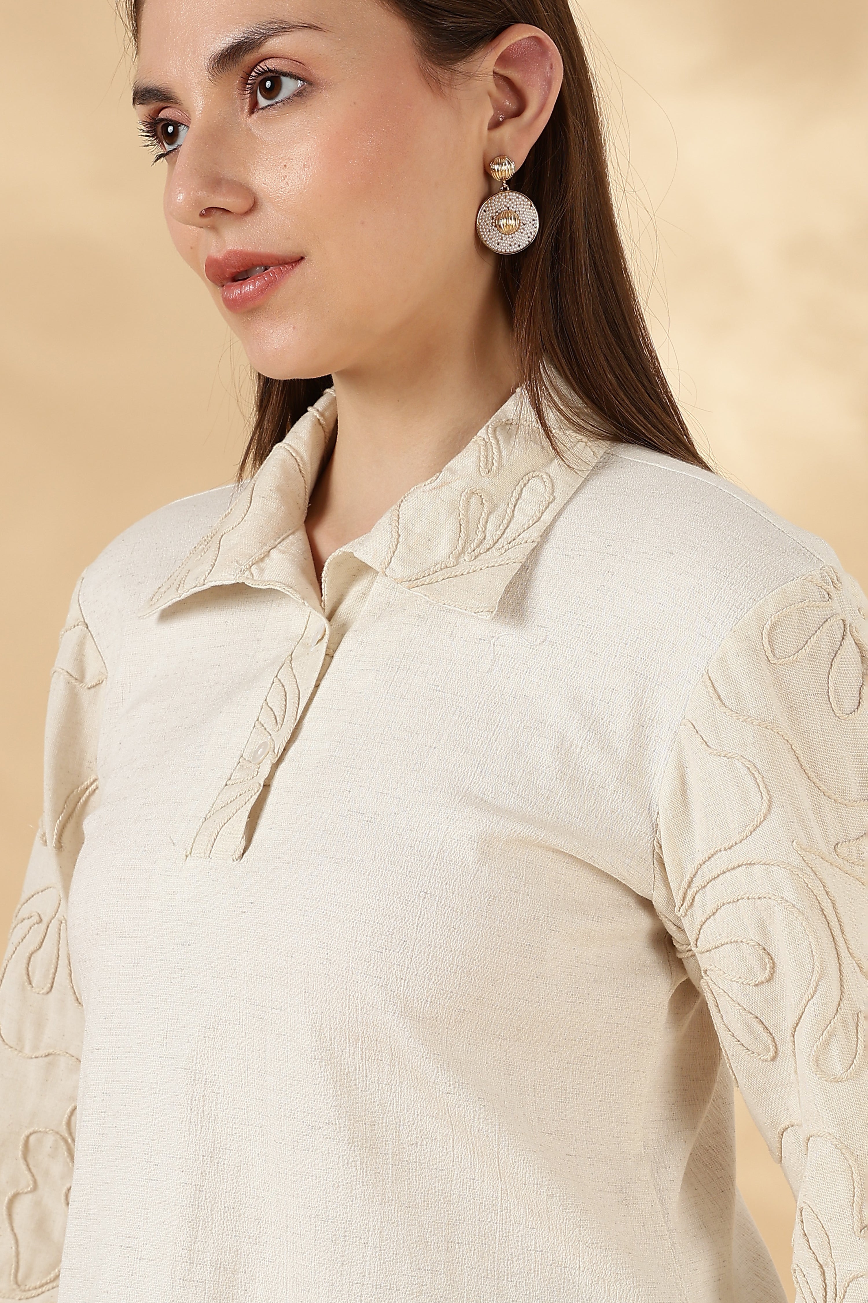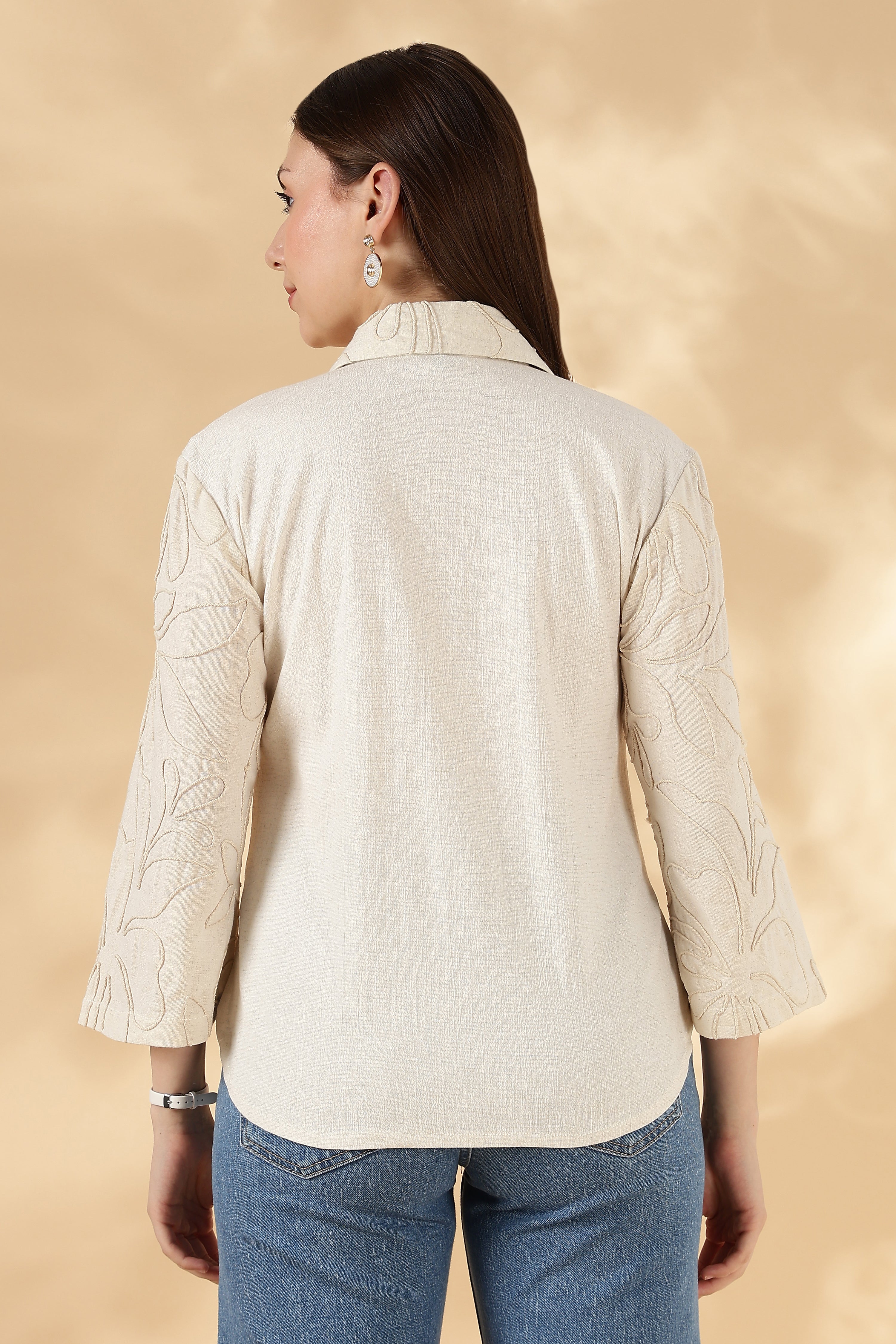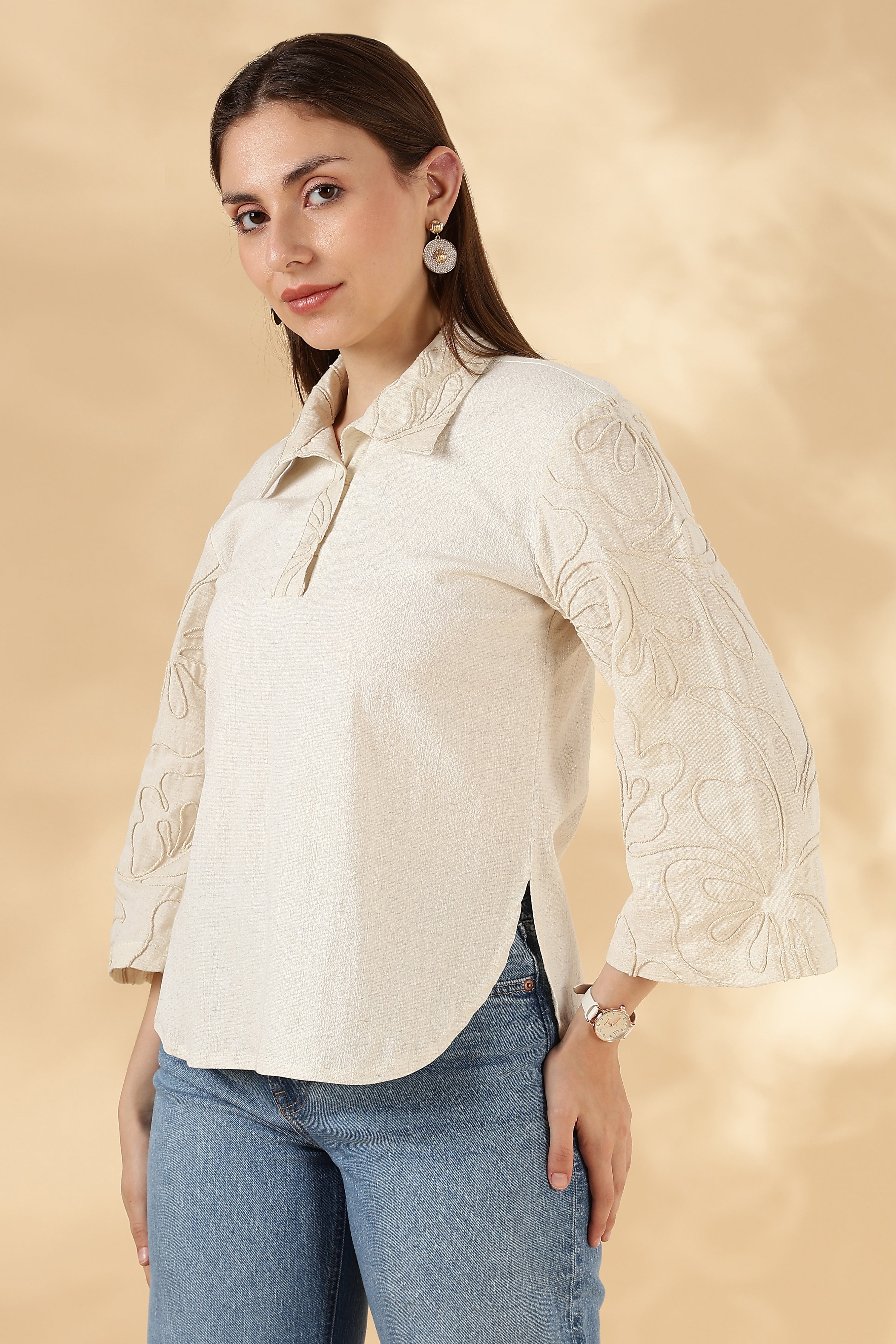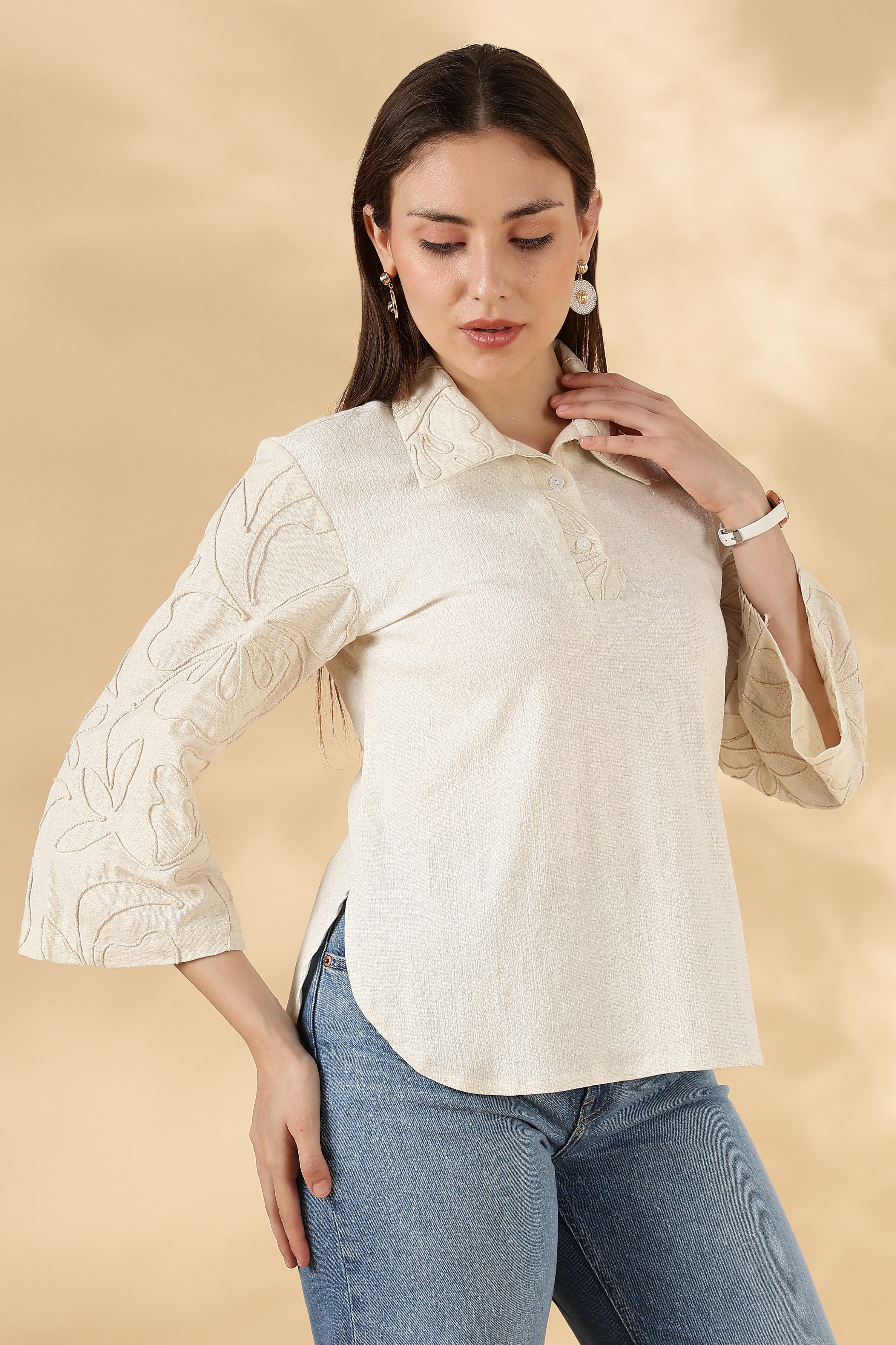 3/4th bell sleeves featuring hand embroidery for artisanal charm.