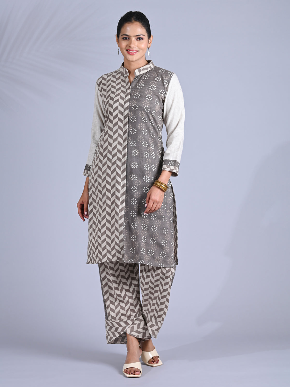 Made from soft, breathable cotton to keep you comfortable all day. Hand block printed in earthy brown and cream tones, offering a unique, artisanal appeal. The mismatched design adds a playful, contemporary twist to traditional prints. The relaxed silhouette is perfect for casual outings, work-from-home days, or weekends getaways