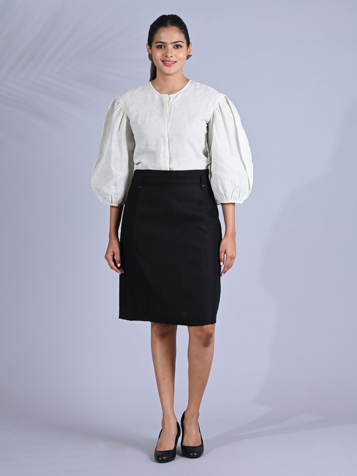 Crafted in pure linen – breathable, soft, and naturally textured Subtle pinstripes add depth and a touch of quiet sophistication Features voluminous three-quarter sleeves for a structured, modern silhouette Front placket with concealed buttons keeps the look minimal and refined Designed for effortless pairing – from tailored trousers to relaxed skirts A wardrobe staple blending classic tailoring with contemporary ease